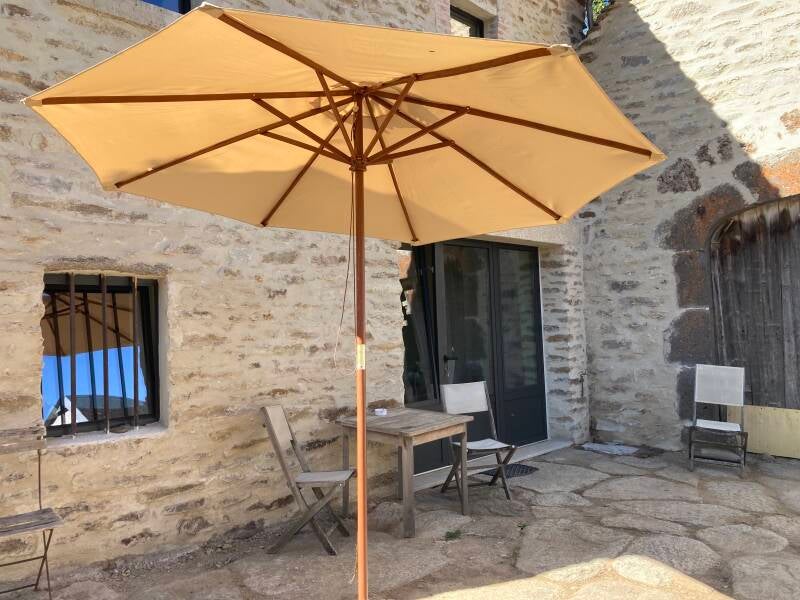 Grande salle de bain avec douche équipée PMR et une toilette séparée. Espace extérieur tranquille sans vis-à-vis. En partie enterré, ce gîte reste frais même en période de canicule. De plein pied, en rez-de-chaussée.