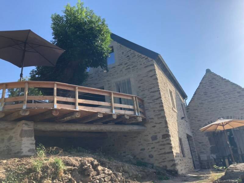 Au rez, spacieuse pièce de vie, entièrement réalisée en matériaux naturels bois-chaux-chanvre, avec une belle cuisine équipée (plaques induction, four électrique, lave-vaisselle, lave-linge), une salle à manger lumineuse et un salon avec poêle à bois. Une grande terrasse suspendue, tout en bois de douglas naturel, ombragée par un vieux frêne.
