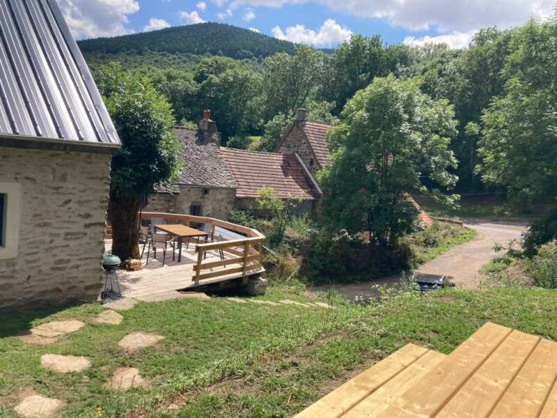 grande pièce de vie avec salon-poêle à bois, un petit salon indépendant, 3 chambres, 2 salles-de-bain, 2 wc séparés, 2 cuisines, 2 niveaux de vie, 3 terrasses et beaucoup d'espace extérieur